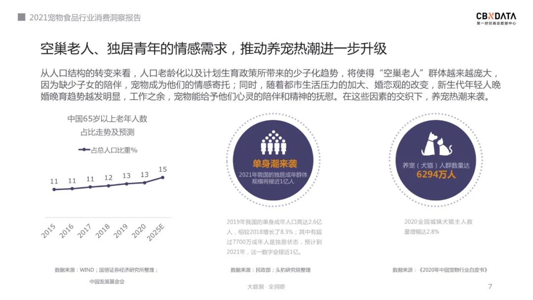 CBNData發佈的**《2021寵物食品行業消費洞察報告》**顯示,2021年我國獨居成年羣體規模將接近1億人,隨着都市生活壓力加大,婚戀觀改變,新生代年輕人在工作之餘越來越需要寵物所帶來的身心陪伴陪伴和精神撫慰。而在當前養寵人羣中,有超40%的人羣為獨居單身人羣。