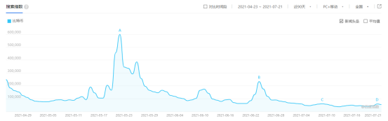 在百度指數中,自6月20日之後,關於比特幣的百度指數一路上漲到6月22日的23萬,此後,就一路下跌,基本上維持在5萬左右,這是自2020年底之後的低谷。