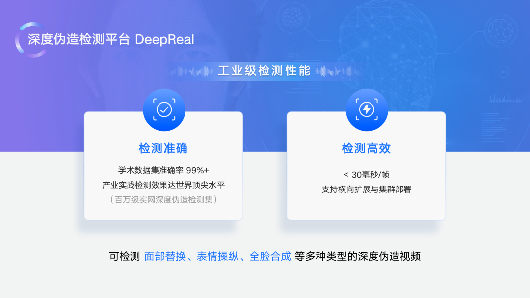 在測試結果方面,DeepReal在學術數據集和ZAO等主流方式生成的網絡數據集中,已達到99%以上的準確率。而在實際應用中,DeepReal的檢測準確率也已達到業界頂尖水平。