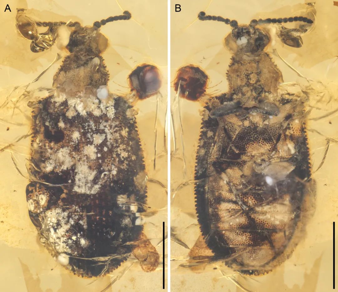 儘管已有多項研究報道了琥珀昆蟲中的肌肉組織,但保存有肌肉的琥珀昆蟲還是較為罕見的。近期,中國科學院南京地質古生物研究所的科研助理李言達、蔡晨陽研究員等人對緬甸琥珀中的原鞘亞目甲蟲開展分類系統學研究時,在滅絕的副齒邊眼甲屬(Paraodontomma Yamamoto)一新種中,首次發現了甲蟲體內原位立體保存的肌肉。該項研究成果已於2021年6月4日在線發表於國際動物學期刊 Papéis Avulsos de Zoologia上。