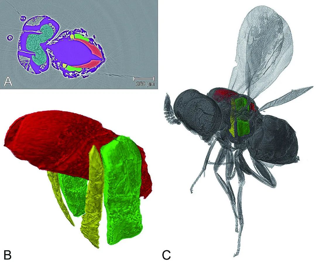 圖2 瓦茲琥珀,膜翅目金小蜂科昆蟲,顯微CT重建,示飛行肌(紅、黃、綠色部分)(引自Van de Kamp等,2014)