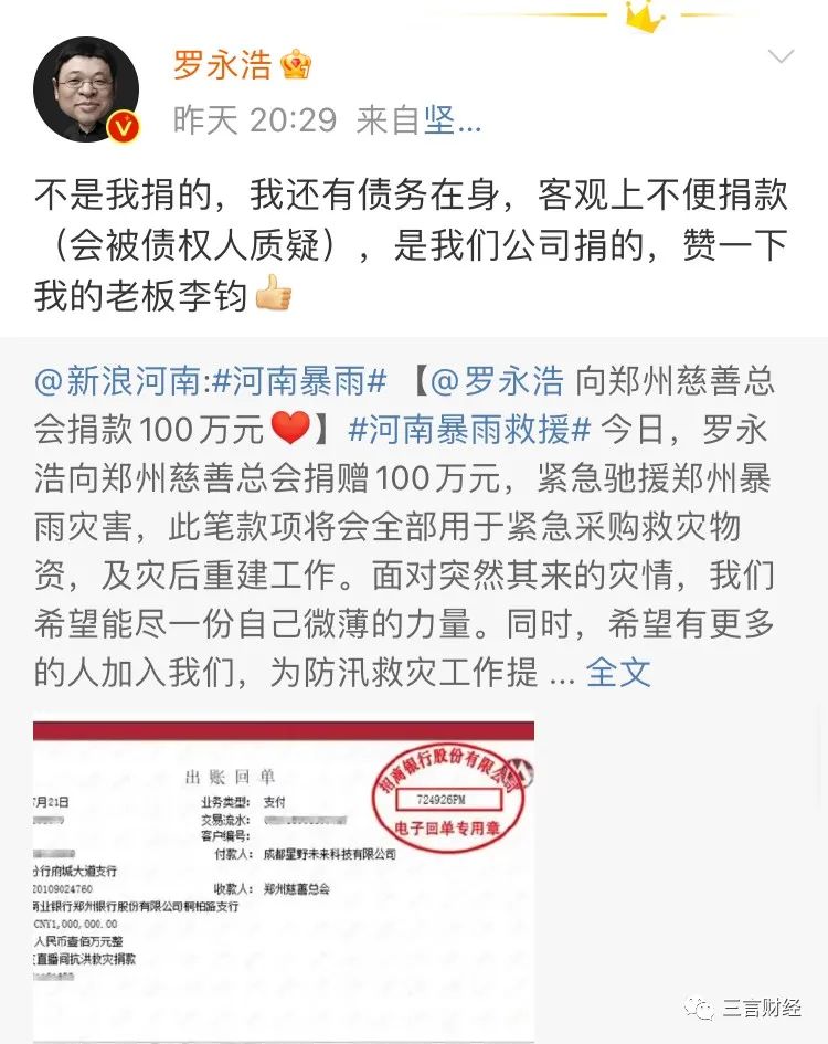 羅永浩的否認捐款的解釋直白點説其實是“如果有錢捐款,為什麼沒錢還款”,畢竟老羅身背幾個億的債務是眾所周知的事情。