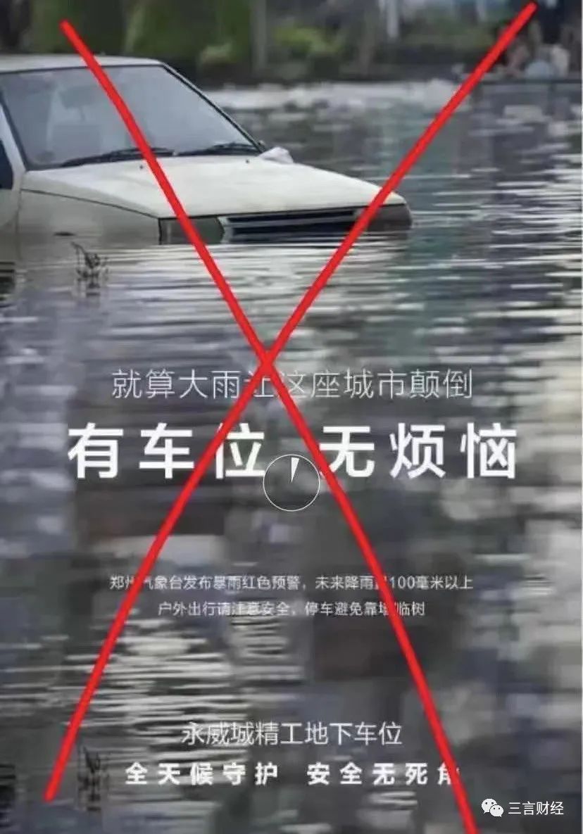 還有房地產商推出宣傳海報,宣傳語為“就算大雨讓這座城市顛倒,有車位,無煩惱”。