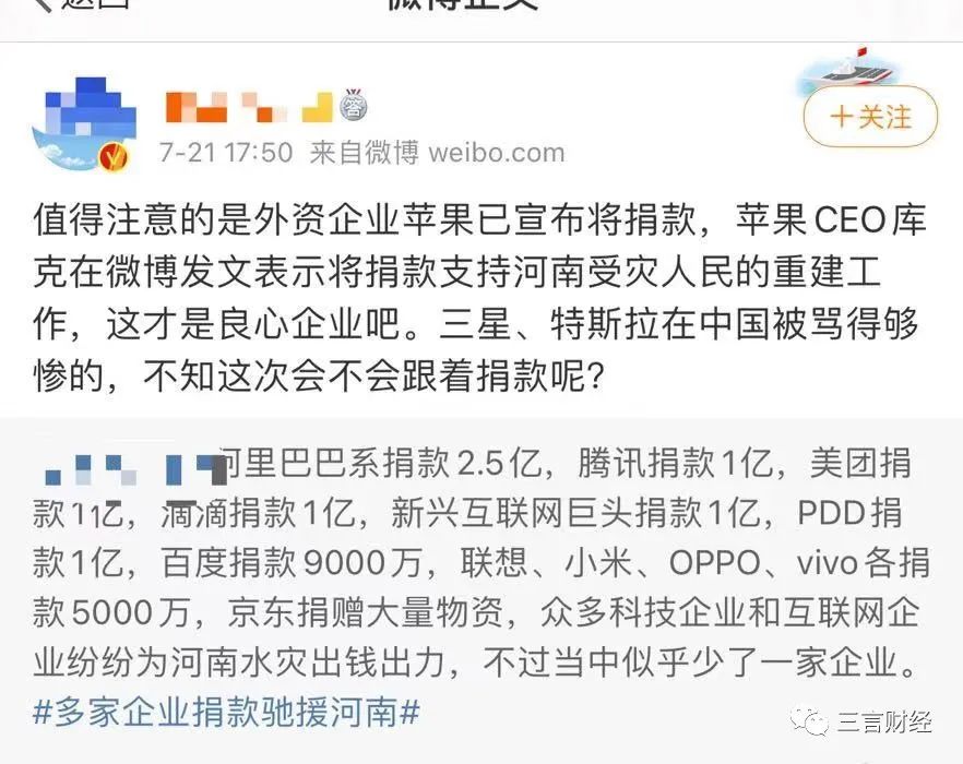 這次災害中,蘋果公司CEO庫克宣佈將捐款支持河南受災人民的重建工作。若國內企業出力、捐款多少有點“天經地義”的意思,蘋果公司作為外資,主動捐錢自然大獲好評。