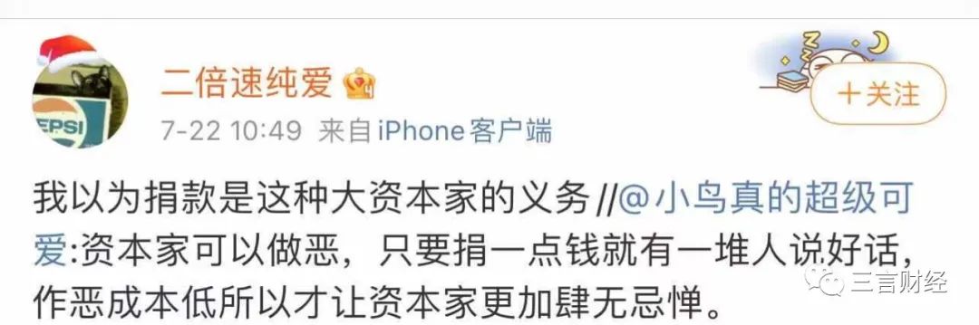 當然有支持者就有反對者,反對者則認為,資本家作惡成本低,“只要捐一點錢就有很多人説好話”。