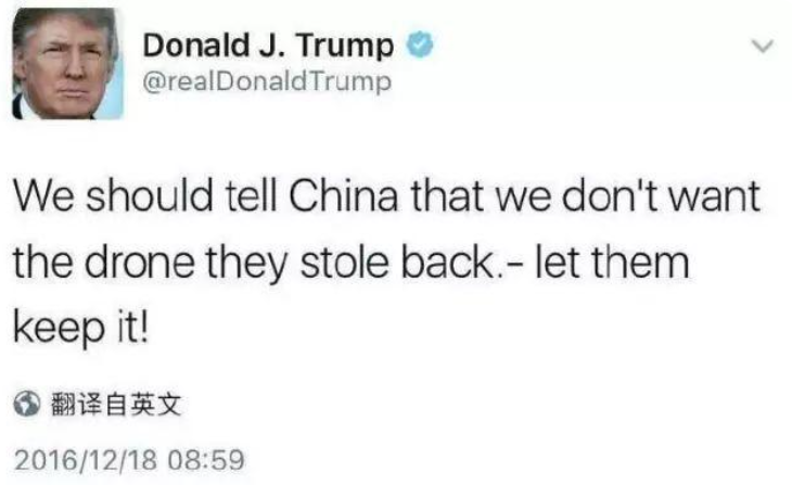 2016年就有外媒報道,中方在南海“國際水域”捕獲一艘美國的無人水下潛航器。川建國得知此事後,立馬委屈地發推喊冤,聲稱“中國在國際水域偷走美國海軍的無人潛航器”,並稱這種行為是“前所未有”。