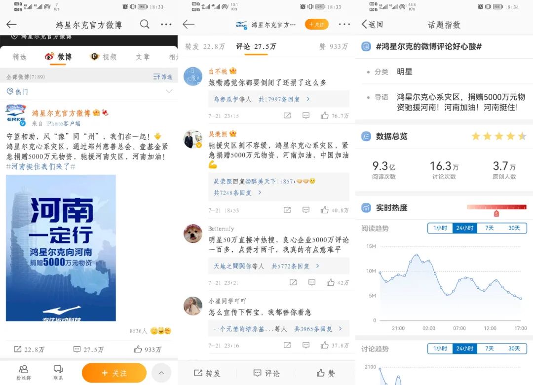 7月21日,鴻星爾克官方微博發佈消息稱,公司“通過鄭州慈善總會、壹基金緊急捐贈5000萬物資”。
