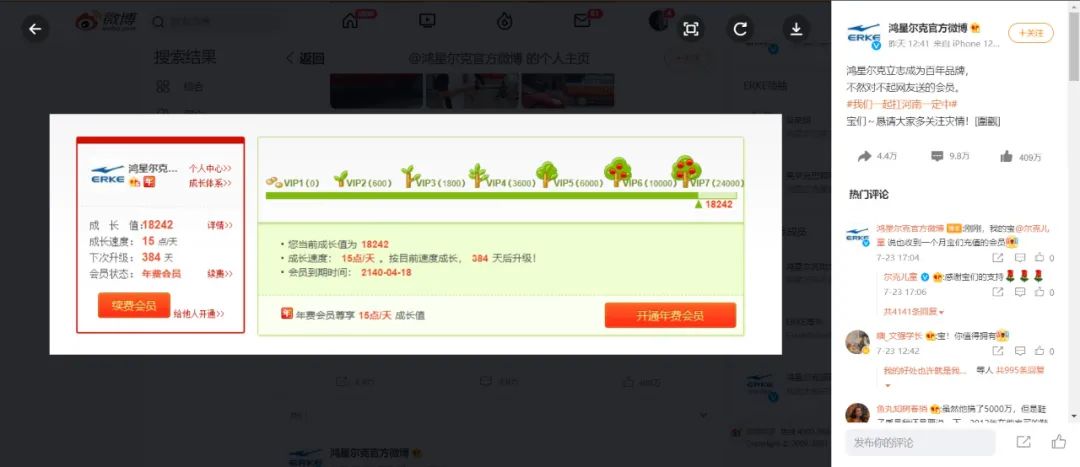 很快,這股“心酸之力”就轉化成了購買力。一方面,看到捐款5000萬的鴻星爾克卻連108元的微博會員都沒開通,網友直接以贈送方式為其續費至2140年;另一方面,大波流量開始湧向鴻星爾克直播間。