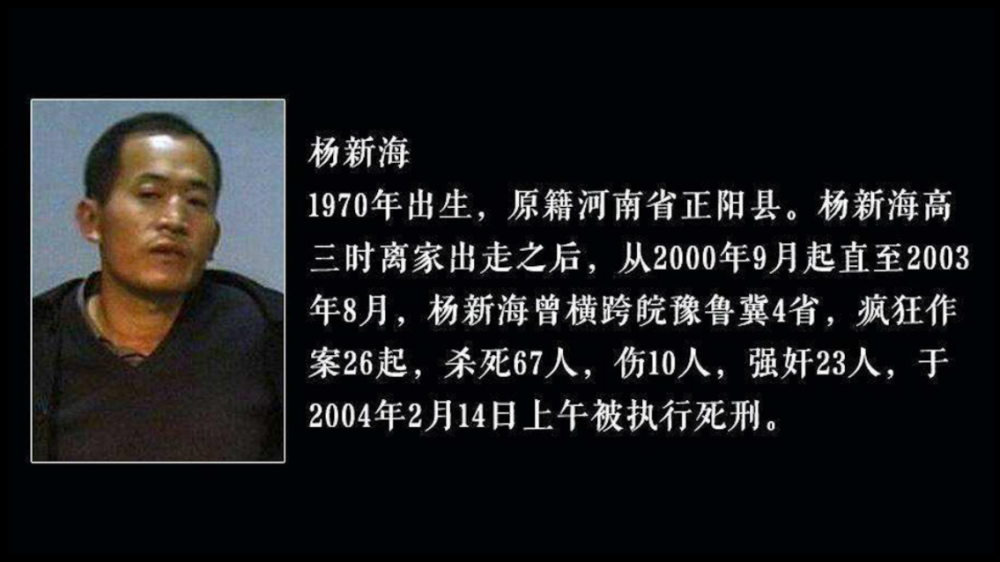 楊新海有個綽號叫做鄉野惡魔,從2000年至2003年短短三年間,他掂着一把小錘、瞪着自行車,在安徽、河南、山東、河北四省之間瘋狂作案26起,殘忍殺害了67人,其中23人還遭到了他的強姦。