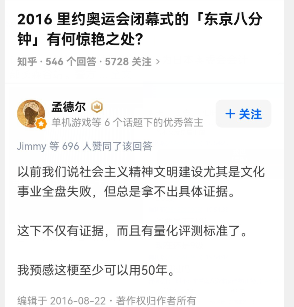 關於前面的特別節目《wassai》也好,開幕式開場的陰間表演也好,如何去誇獎這些節目讓精神日本文化愛好者們費了很多心思。開幕式之後網絡平台上馬上出現了不少科普所謂現代舞藝術,舞踏等概念,試圖告訴大家這些表演有多高級,是普通觀眾欣賞力不夠,認為普通人覺得這些表演“陰間“是不尊重文化差異,不懂包容。問題是,先不説藝術有邊界,小眾藝術就不應該強行帶進這麼重大的場合強行讓全球觀眾接受,這些口口聲聲”包容文化差異“的人如何解釋在日本網民中罵聲也是主流?而且這些精神日本文化愛好者們五年前吹”東京八分鐘“時,可並不是這種説辭。