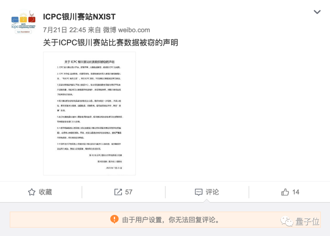ICPC銀川站組委會最近的聲明,也只是説明了有人存在泄題行為,但是對於參賽隊伍是否因此作弊,隻字未提。