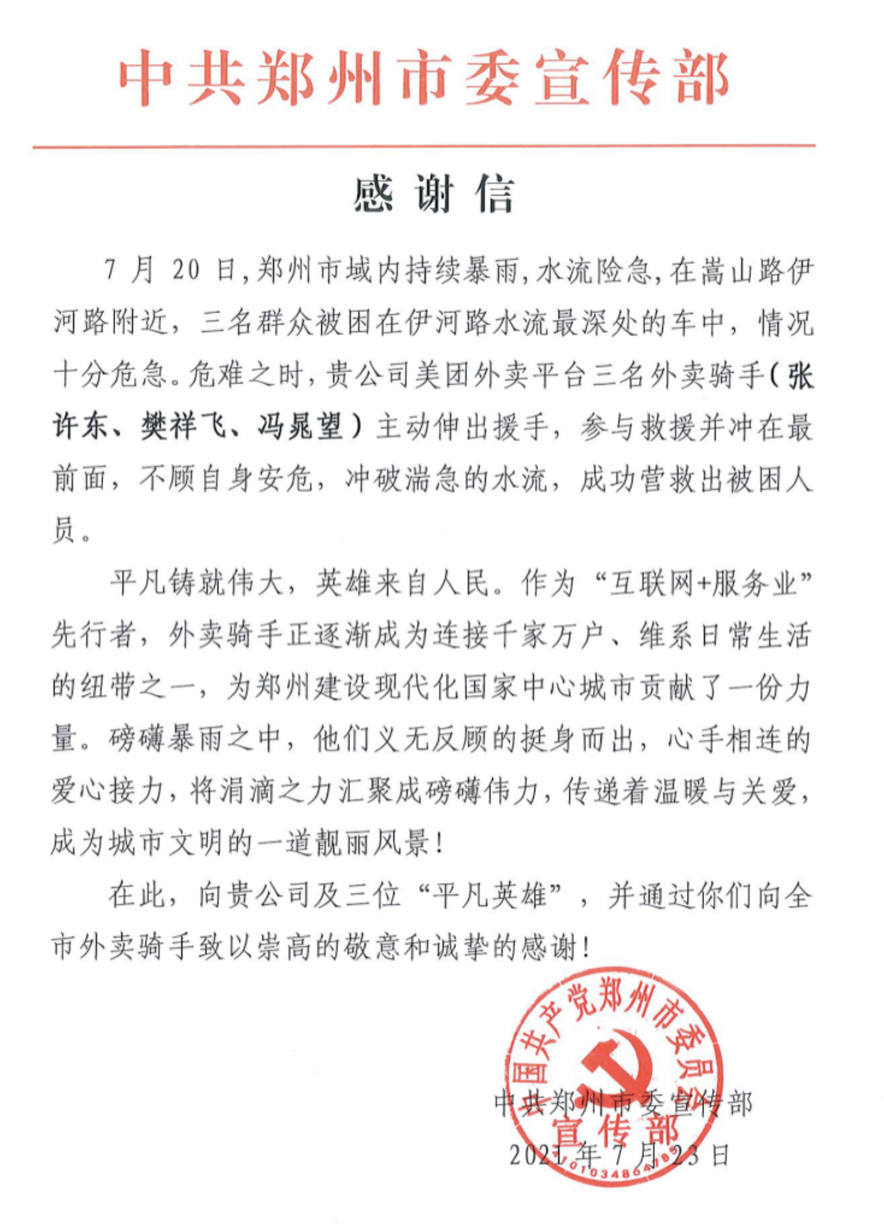 感謝信中提到,7月20日,鄭州市城內持續暴雨,水流險急,在嵩山路伊河路附近,三名羣眾被困在伊河路水流最深處的車重。情況十分危急。危難之時,三名騎手主動伸出援手,參與救援並衝在最前面,不顧自身安危,衝破湍急的水流,成功營救出被困人員。