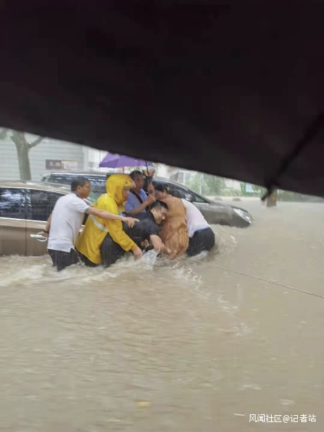 在中原區伊河路鄭州市文聯的門口,他們停留避雨,“那裏大概有三層台階,水已經漫上來,往大廳裏灌了。”不久後騎手們發現,不遠處的馬路中間,一輛七座商務車內發出了呼救的聲音,車內的三人中,還有一名是老人。當時,水沒過了車引擎蓋。