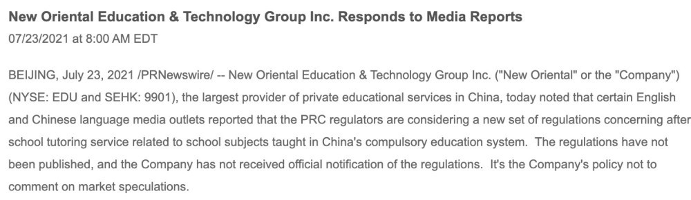 新東方23日晚間在港交所公告則表示,我們注意到,今天有部分英文及中文媒體報導稱,中國監管機構正在考慮制定一套新規例,內容涉及中國義務教育制度下所教授學校科目的相關課外輔導服務。該等規例尚未公佈,本公司亦未收到有關該等規例的正式通知。