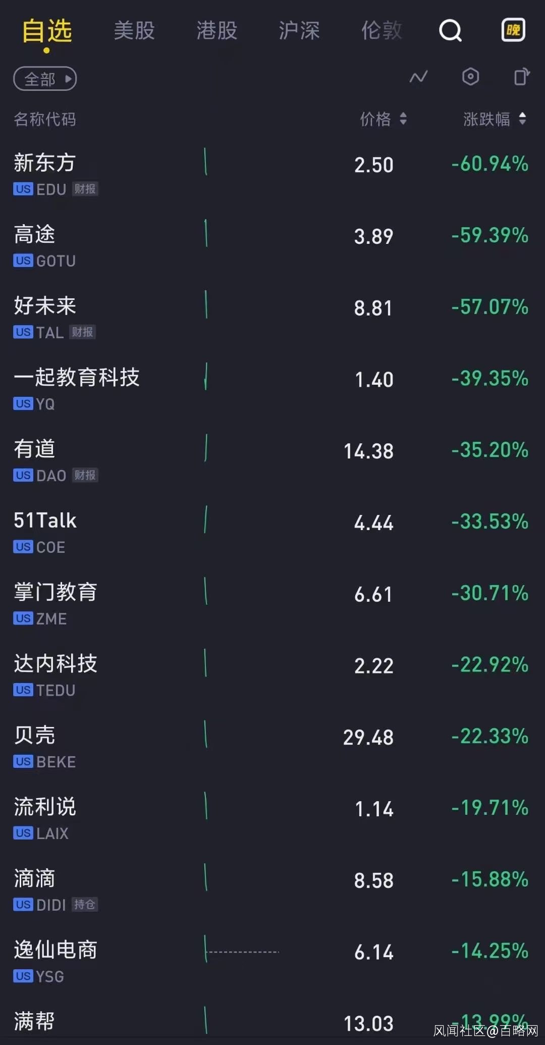 美股中概教育股同樣不容樂觀,開盤即遭重挫,截至美股收盤,好未來在昨天的美股市場最終收跌70.76%,報收6美元/股;因波動過大,一度觸發熔斷。高途集團收跌63.26%,報收3.52美元/股;網易有道股價跌幅超40%,報收12.69美元/股。