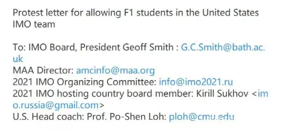 這封信是寫給整個國際數學競賽圈,並以電子郵件的形式分別發給國際奧數競賽委員會主席Geoff Smith 教授,美國數學協會主任 MAA Director,2021年國際奧數競賽組委會,2021年國際奧數競賽舉辦國俄羅斯奧數委員會,美國IMO國家隊教練羅博深。