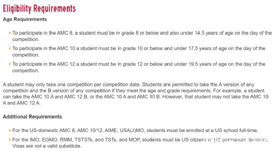 其中就寫道,代表美國參與如下國際競賽:IMO,EGMO, RMM, TSTSTs, TSTs, MOP,參賽選手必須為美國公民或者持有美國綠卡,只有簽證的不算。