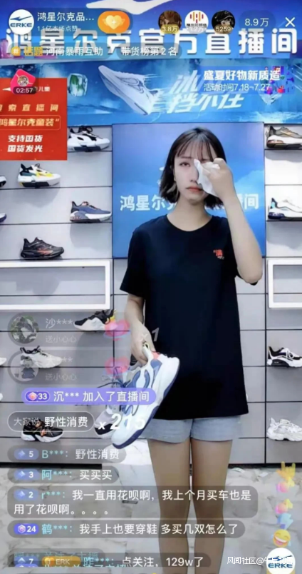 就像鴻星爾克這次真的賣爆了,很多款直接賣斷貨,網友一直在催促上冬款,工作人員一直勸大家理性消費。還説自己從最開始就在鴻星爾克直播間帶貨,之前直播間只有幾十個人,多的時候幾百個人,現在一下十幾萬人,有幾次都激動的哭了…