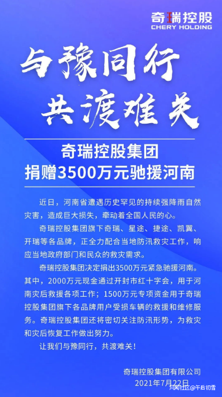 3、奇瑞集團:奇瑞qq大家比較熟吧,可以説很多年前正是這款車讓很多普通人的家庭開上了轎車,現在有瑞虎車型正在不斷發展,但車輛溢價都不高,捐了3500萬,注意它去年一年的淨利潤只有700多萬。