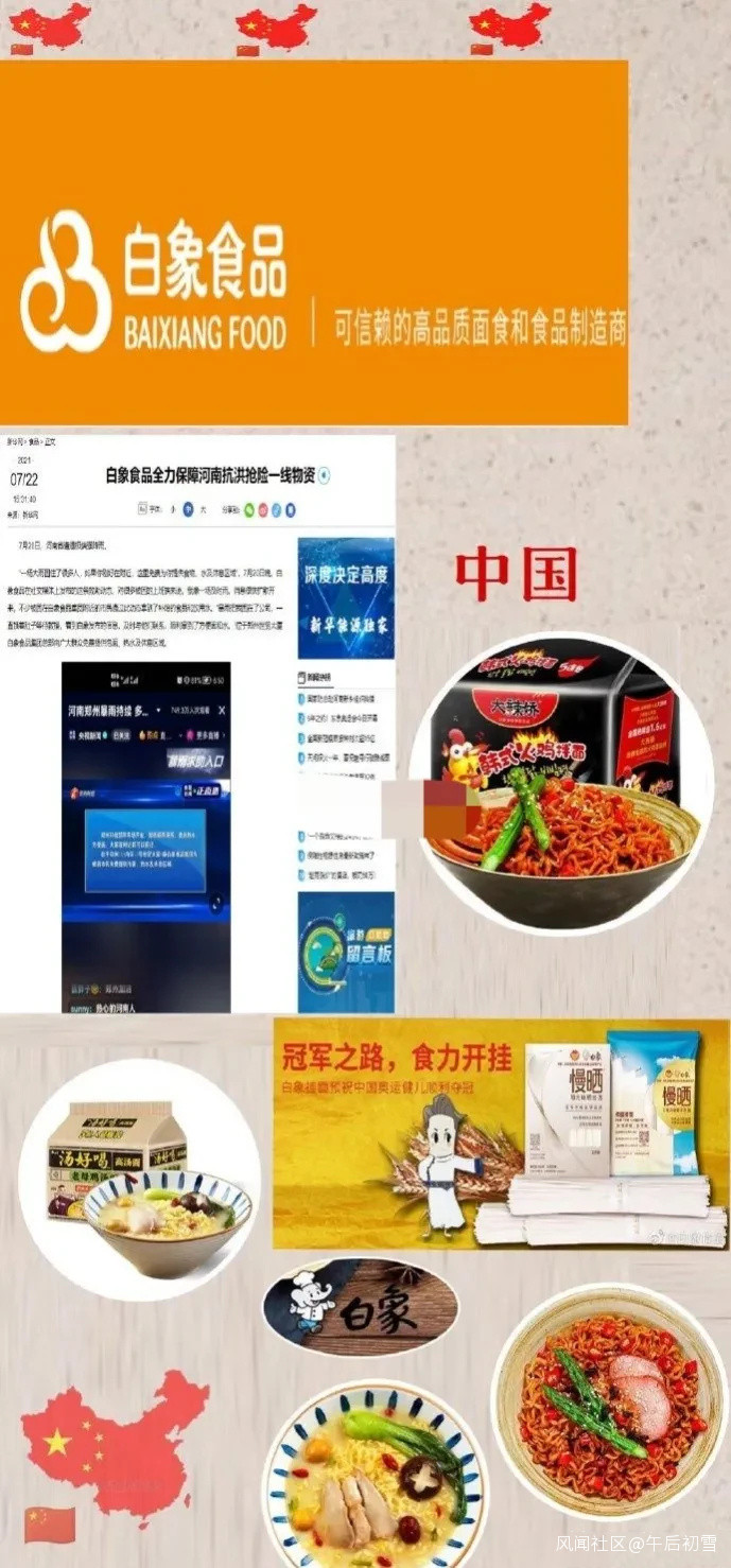 6、白象方便麪:二話不説,把倉庫裏面的方便麪全部都捐完了的國產企業。據説所有人都已經跑去救災去了。其實童年的時候,經常看到各種各樣的方便麪,我記得有白象,方便麪,小浣熊,三鮮伊麪,還有福滿多等等,但現在這些品牌都已經很少看到了。滿眼望去全是康師傅以及躲在角落的一些統一等等。