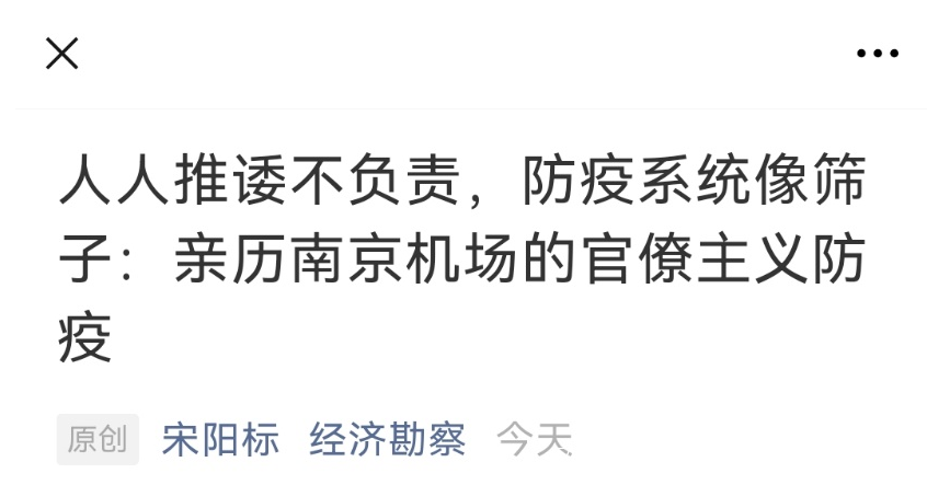 公眾號“經濟勘察”發表原創文章《人人推諉不負責,防疫系統像篩子:親歷南京機場的官僚主義防疫》。