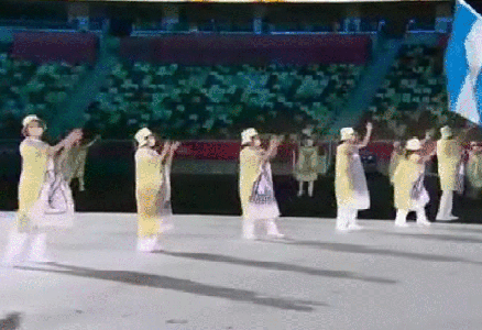 此外,歡迎人員的衣服也是卡通畫風,運動員舉旗進場,他們在一邊搖搖晃晃、非常可愛。整個入場持續了一個多鐘頭,他們也在那兒搖了一個多鐘頭,真是辛苦了