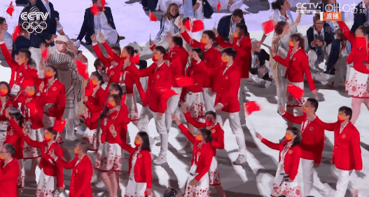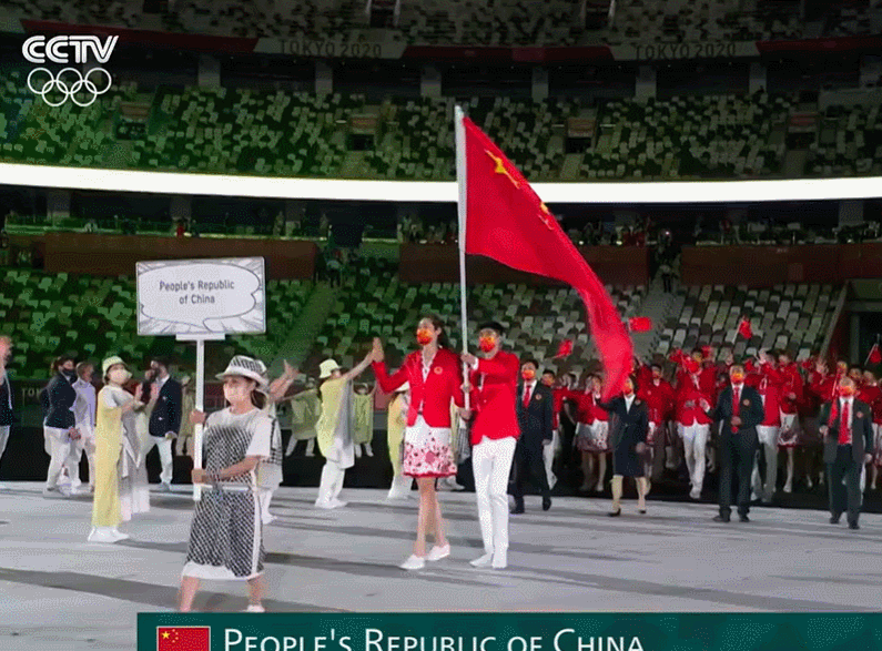 中國體育代表團的旗手由女排選手朱婷和跆拳道選手趙帥共同擔任,按照日本五十音排序,在第110位入場。真是千呼萬喚始出來呀!