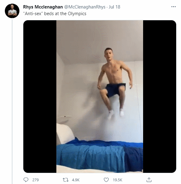 真如此嗎?愛爾蘭體操運動員里斯·麥克萊納漢做了試驗,他拍了一段視頻,在自己的牀上猛跳,證明牀能夠經受劇烈活動,稱“反性愛牀”是“fake news(假新聞)”。奧運會官方Twitter轉發了他的視頻,留言説:“謝謝你揭穿了這個謠言。”