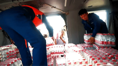 從照片中我們可以看到直-20的後艙被某品牌的礦泉水給塞的滿滿當當,估計一次能裝運50件以上的礦泉水或200到300箱方便麪,跟一台小貨車差不多了,直-20型突擊直升機的貨物裝載能力從中可見一斑。