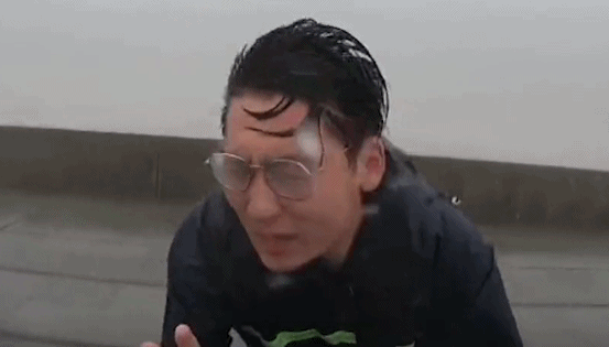 在台風中凌亂的記者小哥