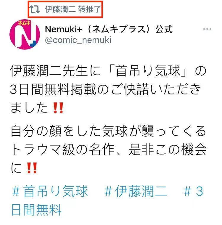 吃瓜吃到了自己的,伊藤潤二還跑去轉發了這條公告。