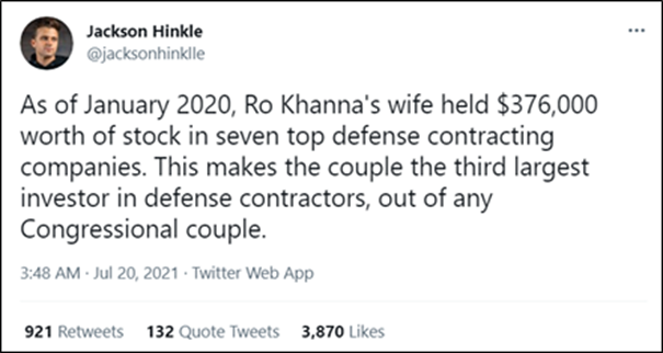 也有人指出,另一位民主黨議員羅·卡納的妻子持有多家國防承包商的股票,也使得他們夫婦是國會議員中持有此類股份最多的人。也就是説,佩洛西夫婦的操作不僅不是獨一家,甚至可能還算不上“大魚”。