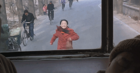 孫納穿着一身紅色的棉襖,一路追逐着公交車,叫着他的名字。