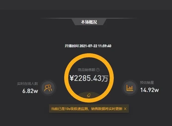 此外,抖音數據也同樣亮眼,截至目前,該場直播的累計觀看數達2493萬,在線峯值人數10.6萬,銷售額達到2285.43萬。