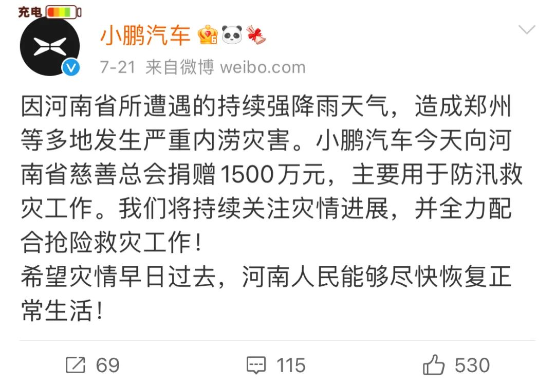 還比如電動汽車品牌蔚來、小鵬、理想,這些新能源品牌其實自己也都過得不太好,但還是分別拿出了1500萬、1500萬、1000萬人民幣馳援河南。