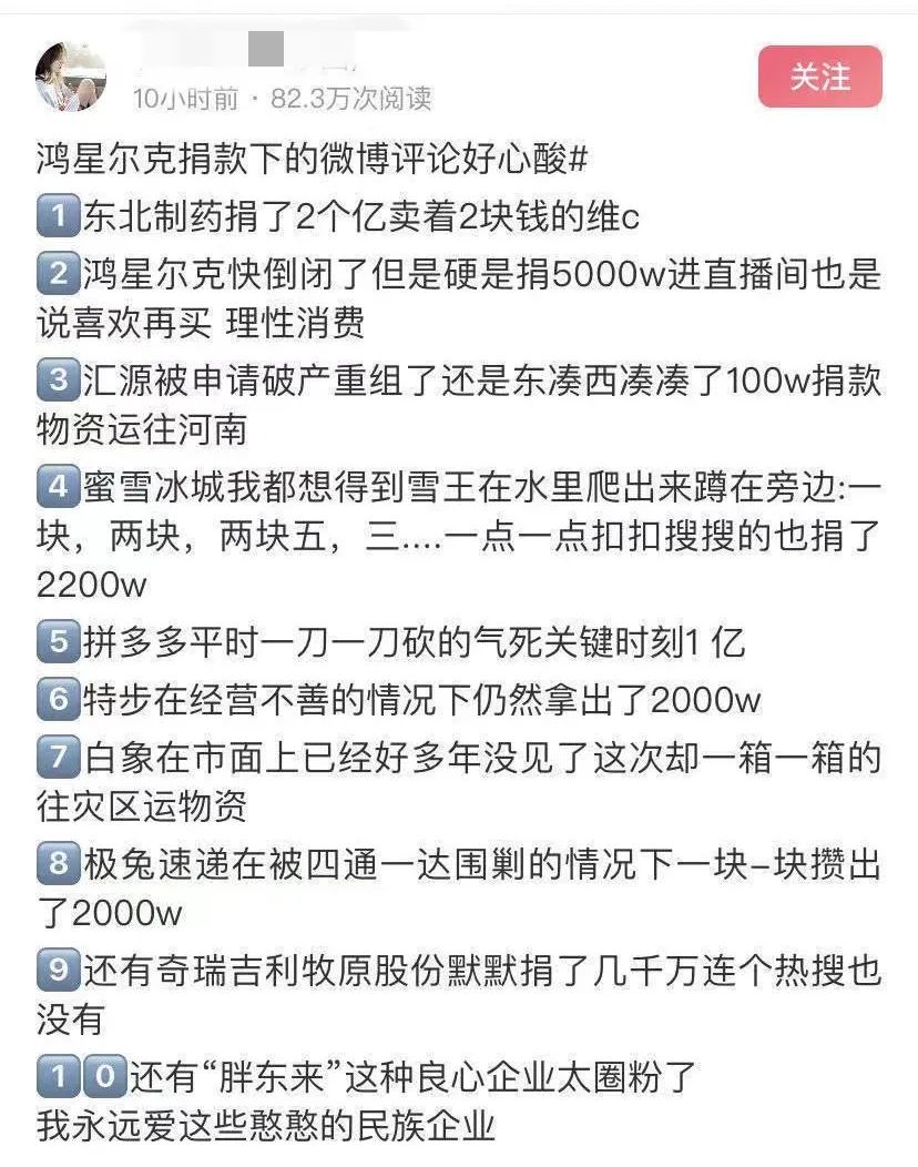 其實,在河南這場突如其來的天災面前,如****鴻星爾克一樣第一時間馳援的企業不在少數。