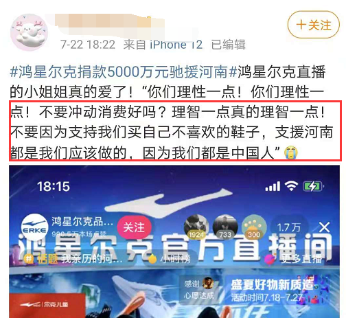 嚇得鴻星爾克官博運營的工作人員馬上發博:“鴻星爾克立志成為百年品牌。”