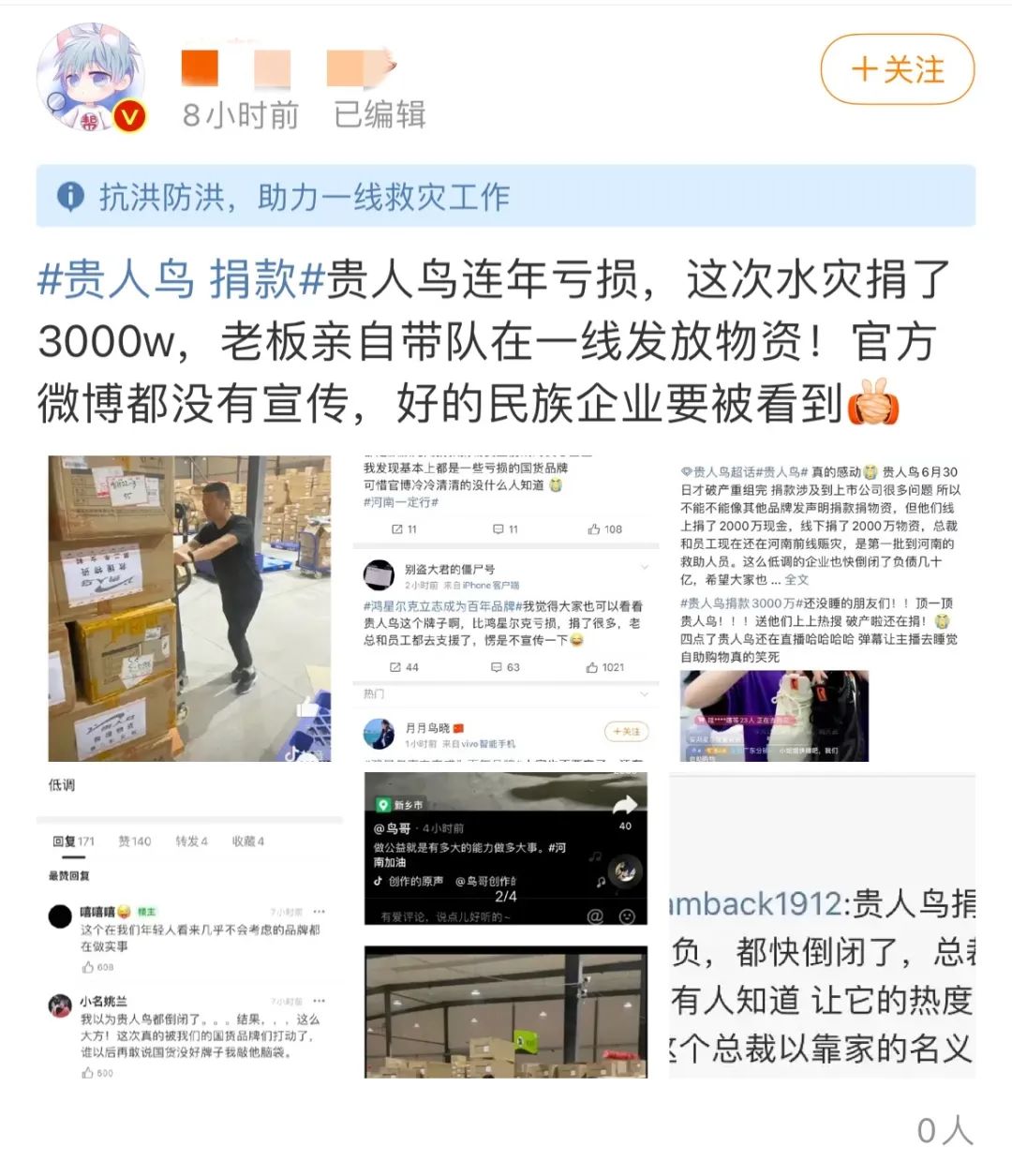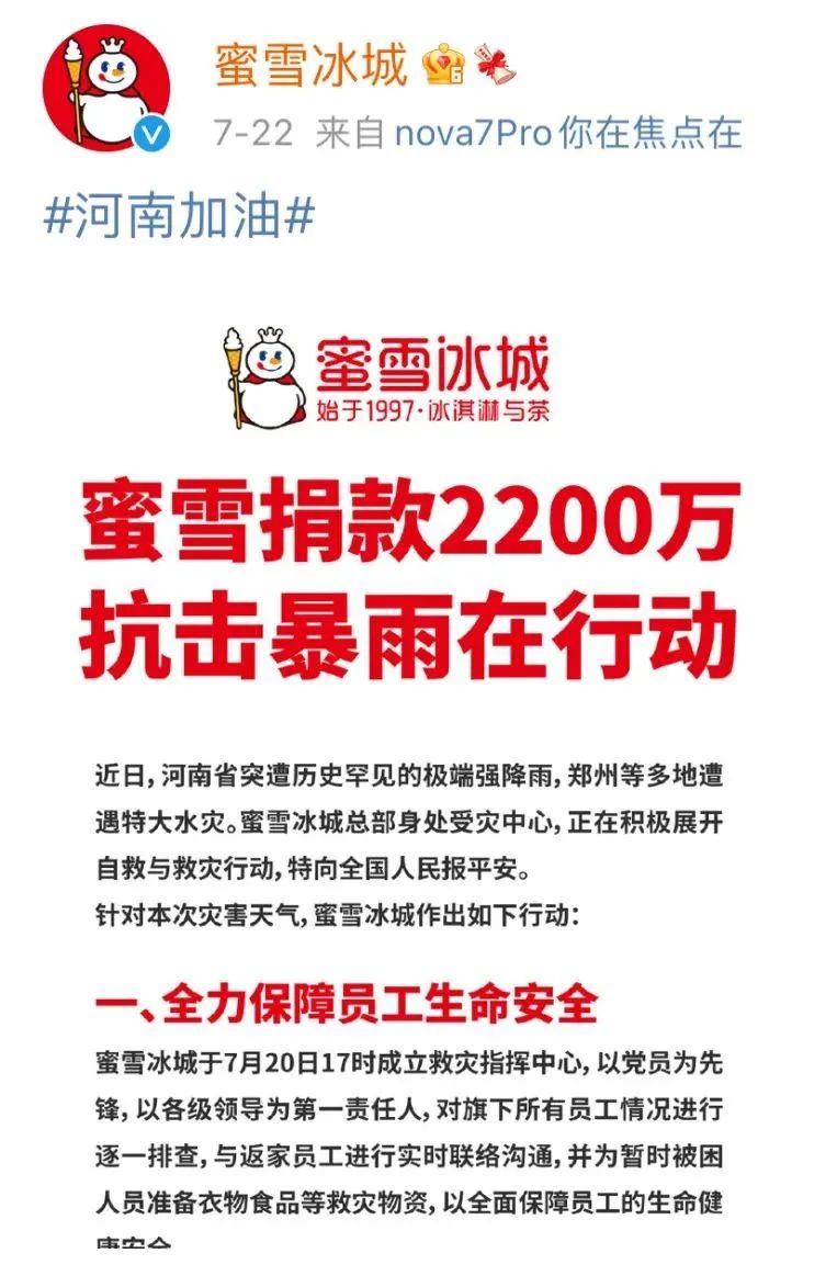 比如公司總部在河南的蜜雪冰城,即使身在災區,仍不忘向重災區輸送物資;