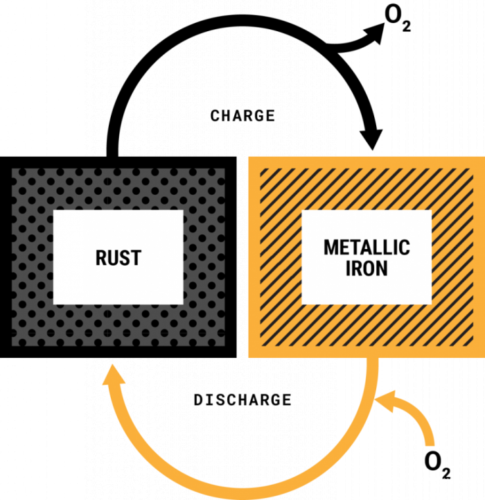 鐵-空氣電池的工作原理是啓動和逆轉生鏽過程。金屬鐵在放電循環中跟氧氣結合釋放能量,然後當能量被施加到鐵鏽上時,它又會轉化回金屬鐵並釋放氧氣。由於浪費的水解問題,這項技術被擱置了幾十年,直到2012年才得到解決。