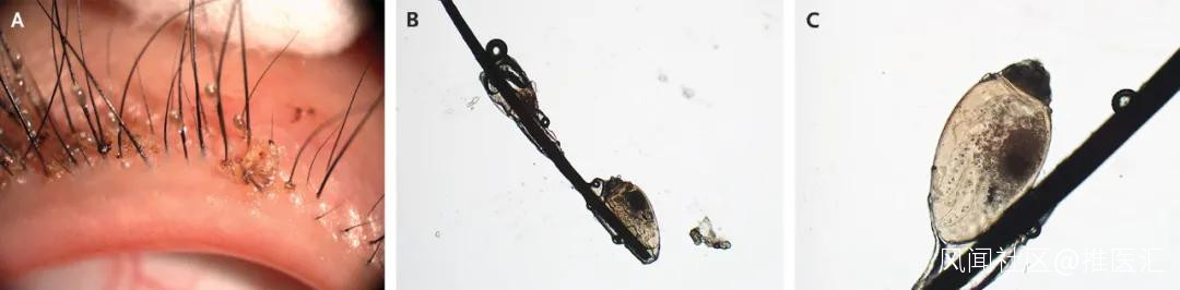 體格檢查發現雙眼瞼皮膚充血,裂隙燈檢查顯示睫毛根部附着蟲體和半透明蟲卵(見上圖A)。顯微鏡下檢查可觀察到蟲卵的內部結構(圖 B,在圖 C 中放大倍數更高)。蟲體經識別為陰蝨。
