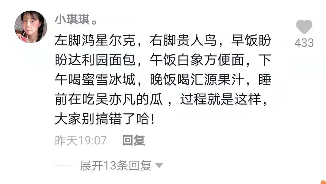 左腳鴻星爾克,右腳貴人鳥,早飯達利園,下午蜜雪冰城。