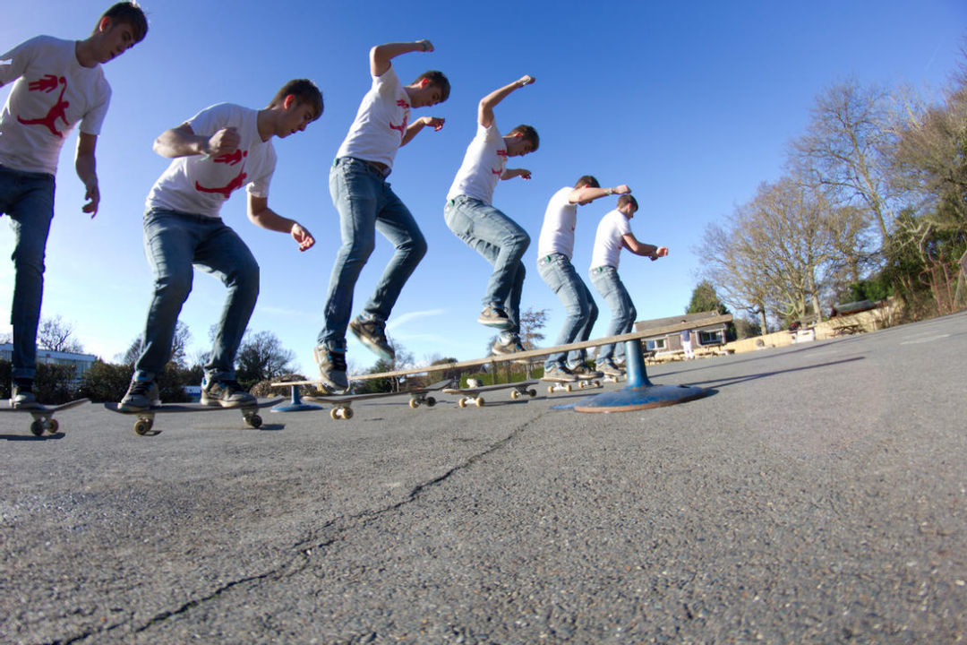 而且ollie是幾乎所有高階技術動作的核心,ollie練不好,更高階的技術動作就沒辦法練了。這是一種讓滑手能夠和板跳到空中的技巧,可以利用這個技巧越過一些障礙。它的整個過程如下:首先運動員會降低自身的重心,從而使得他們跳的更高。起跳的時候,和Hippie Jump的區別就是,收腿的順序不一樣。這也從上圖可以看到,兩個輪子離開地面的時間也不一樣。