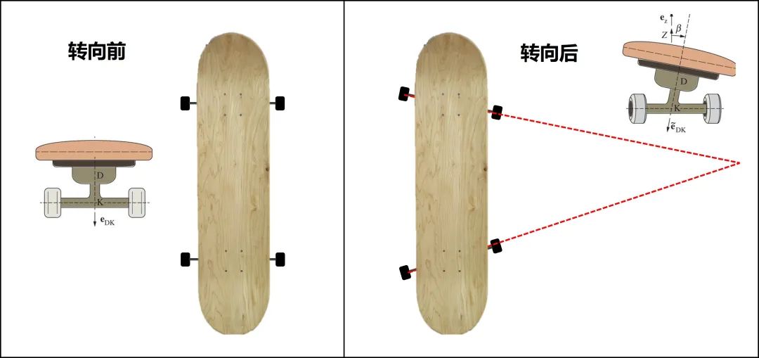 同時,如果速度比較快,還需要通過傾斜身體,讓重力與支持力的合力提供向心力。這樣才不會在板上被甩出去。不過需要注意的是,這裏轉向的原理並不符合汽車轉向中的阿克曼轉向幾何,因為滑板內外輪的軸向始終是同一條直線。