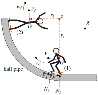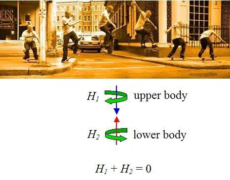 整個人服從角動量守恆,由於沒有任何扭矩的產生,所以無法在空中完成整體的旋轉。如何做到轉體180°的呢?實際上他們是通過上下半身以相反的方向旋轉的方式保持動量守恆,來保證滑板180°的旋轉。