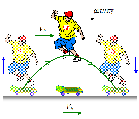 先説一個非常簡單的技術動作——Hippie Jump。運動員在板上豎直起跳,和板保持相同的水平方向速度,相對於板做了一個上拋運動。但是相對於地面就是水平速度為板的速度的斜拋運動。