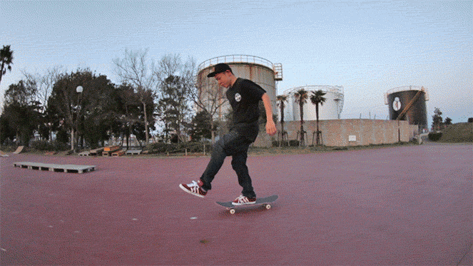 這也是一種基礎的技術動作,需要用到角動量守恆的原理。需要在ollie的基礎上再加上滑板順時針/逆時針旋轉180°(regular腳位逆時針旋轉,goofy腳位順時針旋轉)。