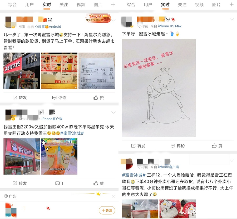 在此次河南災情發生後,茶飲品牌蜜雪冰城也宣佈向受災地區捐款2200萬元。據悉,蜜雪冰城總部就位於河南鄭州,在自身也受災的情況下,蜜雪冰城依舊賣力捐款,再加上其品牌產品平時多以物美價廉的形象示人,大方捐款的行為更加博得網友好感,也引發了網絡熱議。一時間,許多網友在微博曬出蜜雪冰城的購買訂單,表示大力支持。