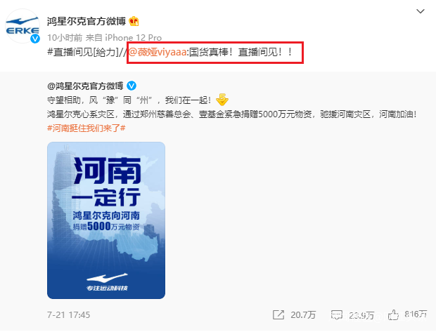 看似平常的企業捐款事件,卻在微博引起極高討論度。2021年7月22日晚上9點,話題#鴻星爾克的微博評論好心酸#登頂微博熱搜榜。隨後,鴻星爾克在抖音和淘寶的品牌直播間也得到網友們的行動支持,人氣值和銷售額大漲,知名主播薇婭更是在微博向鴻星爾克拋出橄欖枝,發出直播間合作邀約。
