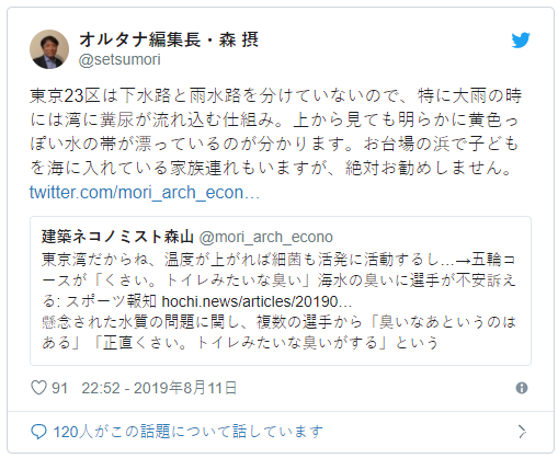 「オルタナ」的主編森摂也曾就台場的大海在推特上做出過這樣的警示。