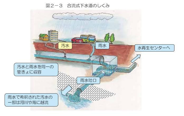 (在東京23區並沒有將下水道和雨水道分開設置,所以在下大雨的時候,會將糞尿也一起排進東京灣。從天上看就能明顯的看見黃橙橙的一大片。所以強烈不建議帶孩子去御台場的海里游泳。)